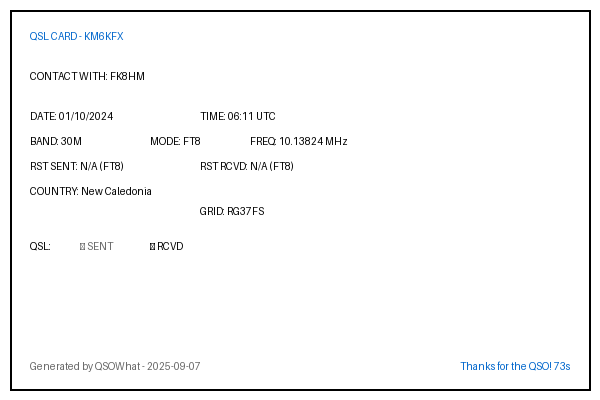| FK8HM | 2024-10-01 | 06:11 | 30M | FT8 | New Caledonia |