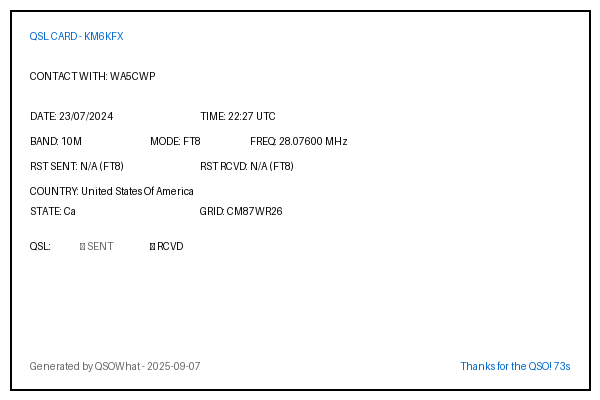 | WA5CWP | 2024-07-23 | 22:27 | 10M | FT8 | United States Of America |