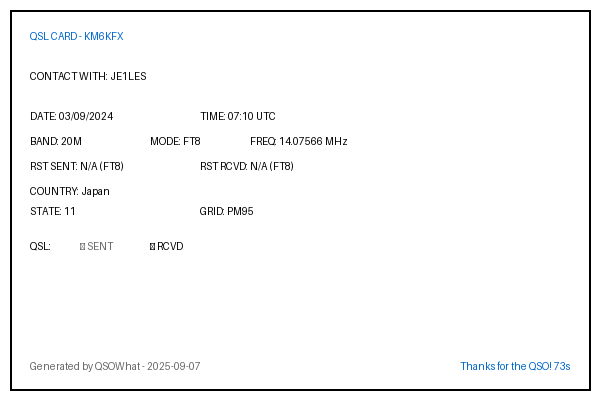 | JQ1LNZ | 2024-09-13 | 06:05 | 20M | FT8 | Japan |