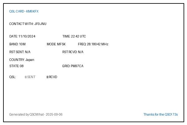 JA6NQT 2025-03-15 23:06 10M FT8 Japan PM53FO N/A (FT8)