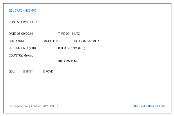| XE1YO | 2024-10-11 | 05:37 | 40M | FT8 | Mexico |
