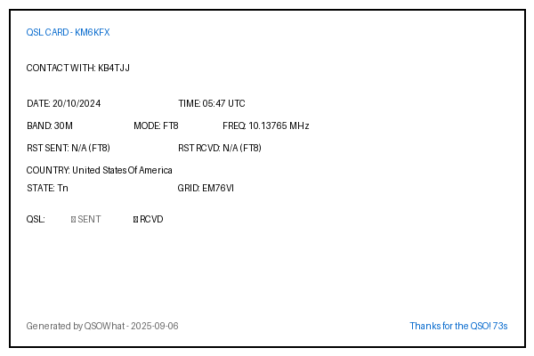 | JS1TSS | 2024-09-29 | 05:57 | 20M | FT8 | Japan |