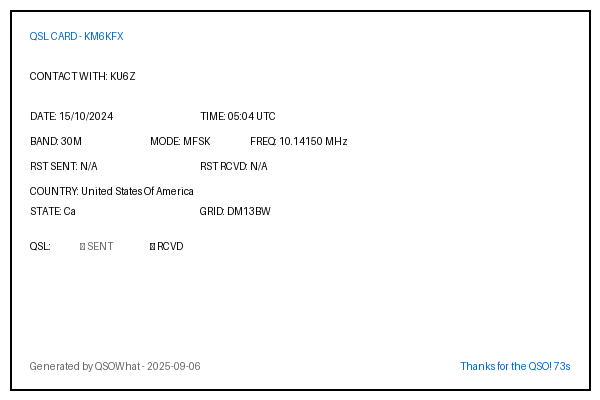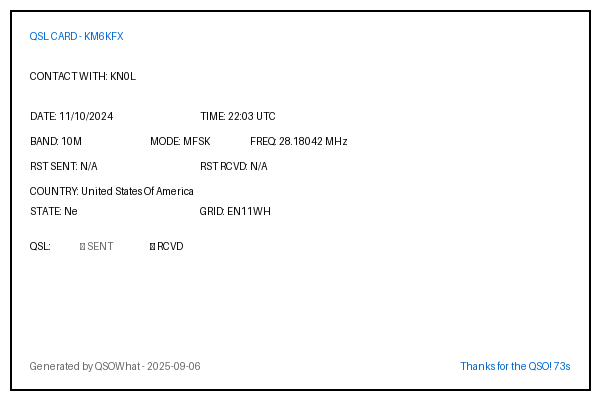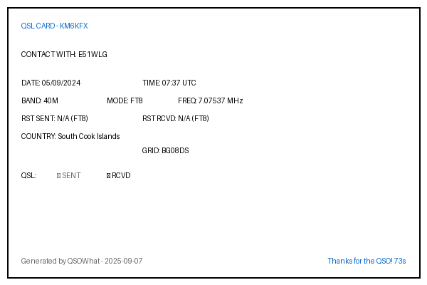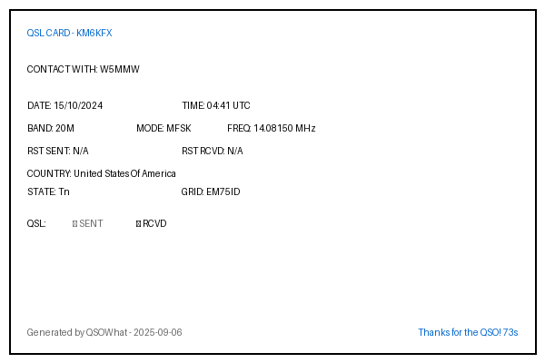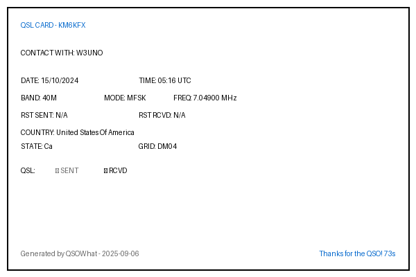 | JH7IMX | 2024-10-05 | 08:31 | 40M | FT8 | Japan |