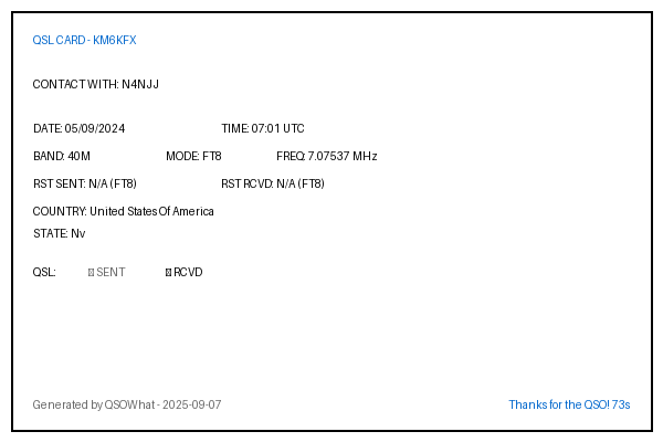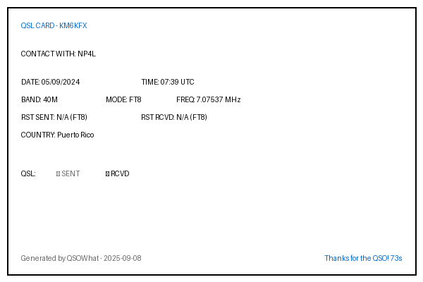 | KM6SO | 2024-09-01 | 07:00 | 40M | FT8 | United States Of America |