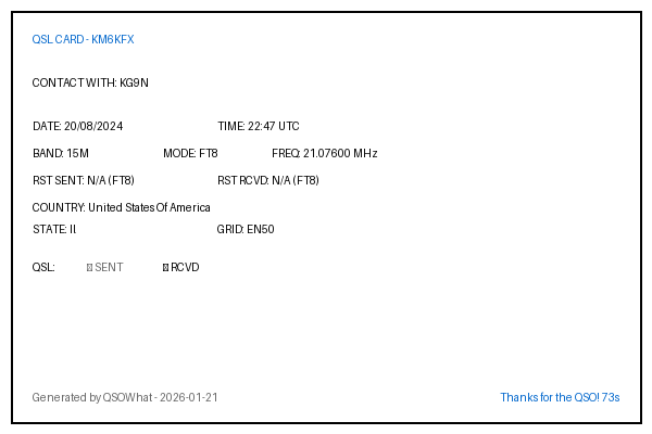 | KG9N | 2024-08-20 | 22:47 | 15M | FT8 | United States Of America |