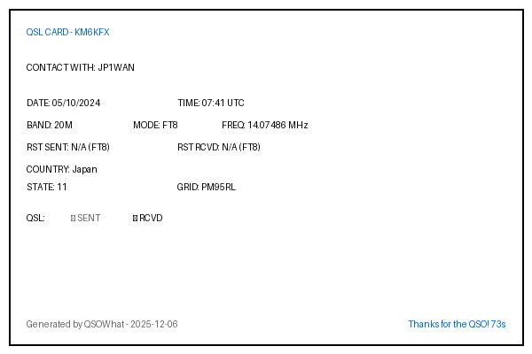 JA1PKI 2024-10-20 08:17 20M FT8 Japan QM06GJ N/A (FT8)