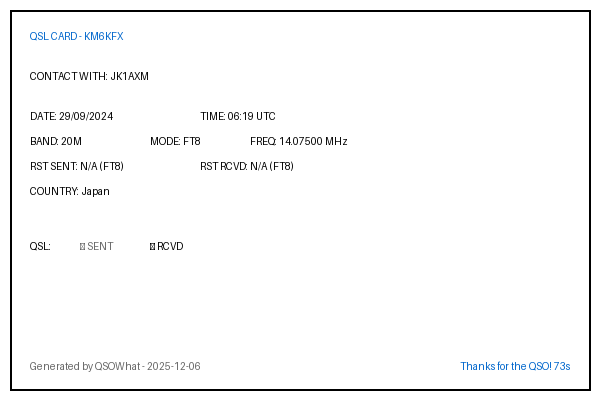 JK1AXM 2024-09-29 06:19 20M FT8 Japan N/A (FT8)