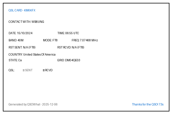 | WB6UNG | 2024-10-15 | 06:55 | 40M | FT8 | United States Of America |