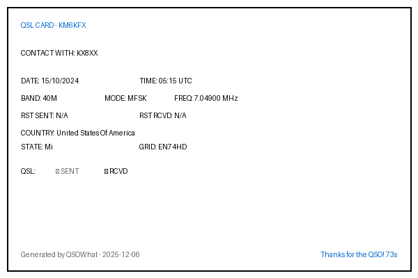 | KX8XX | 2024-10-15 | 05:15 | 40M | MFSK | United States Of America |