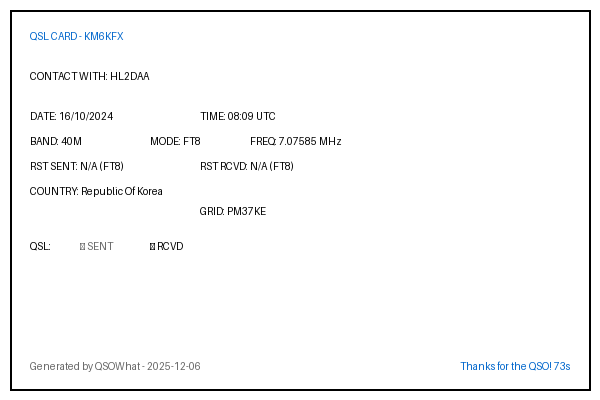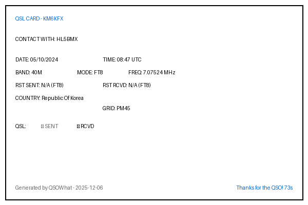 | HL5BMX | 2024-10-05 | 08:47 | 40M | FT8 | Republic Of Korea |