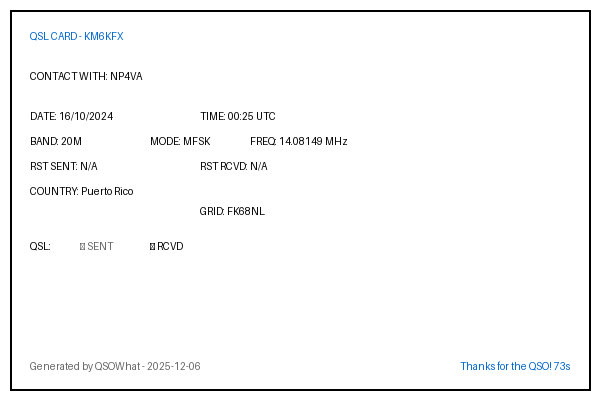 | KH6DC | 2024-10-01 | 07:16 | 30M | FT8 | Hawaii |