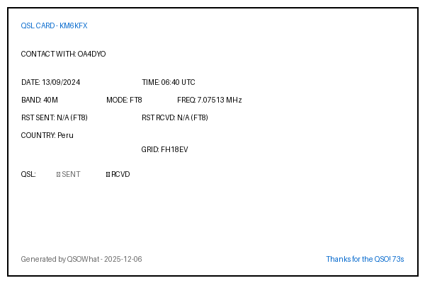 | HI3QMT | 2024-09-05 | 06:27 | 40M | FT8 | Dominican Republic | N/A (FT8) |