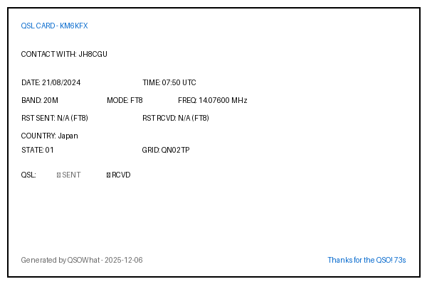 | JH8CGU | 2024-08-21 | 07:50 | 20M | FT8 | Japan |