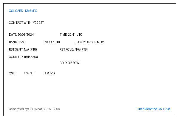 | YC8DYX | 2024-08-24 | 15:43 | 20M | FT8 | Indonesia |